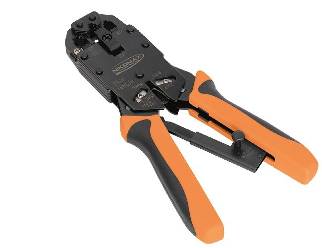 Инструмент обжимной профессиональный, 3 гнезда, торцевой, с храповиком, совместим с коннекторами: RJ45/8P8C, RJ12/6P6C, RJ11/6P4C, 4P4C, 4P2C, DEC/6P6C.