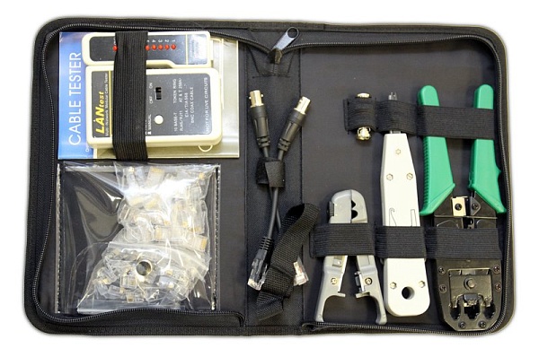 Набор инструментов (обжим 8P+6P+4P, заделка KRONE, зачистка UTP/STP, тестер кабеля RJ45, BNC и RJ11/12). В комплект входит: LY-T2007C - обжимные клещи, LY-501B - нож для зачистки и резки кабеля, LY-T2021 - нож KRONE, LY-CT007 - кабельный тестер с батарейкой 9В + коннекторы RJ11+RJ45 по 20шт.
