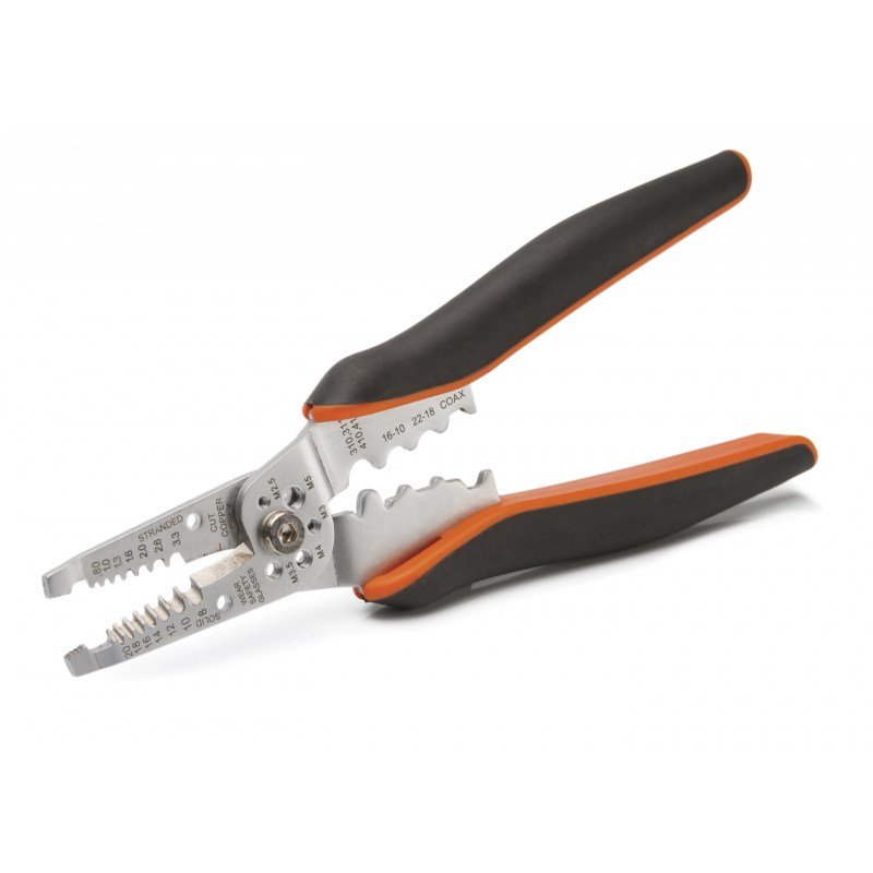Многофункциональный ручной стриппер из нержавеющей стали, снятие изоляции и резка проводов 0.5…6 мм², резка винтов с резьбой М2.5, М3, М3.5, М4, М5, опрессовка наконечников сечением 0.5...6 мм², пассатижи, отверстия для формирования петель, длина 210 мм, вес 160 г.