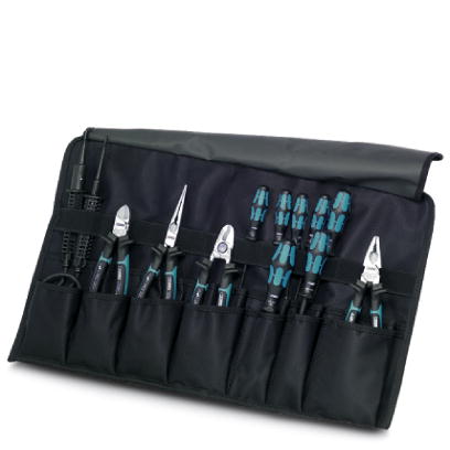 Сворачивающаяся сумка для инструмента. В комплекте: кабельный резак, бокорезы, пассатижи, острогубцы, отвертка VDE плоская: 0,4x2,5/0,5x3,0/1,0x4,0/1,0x5,5 крестовая: PHO/PH1/PH2, индикатор наличия напряжения.