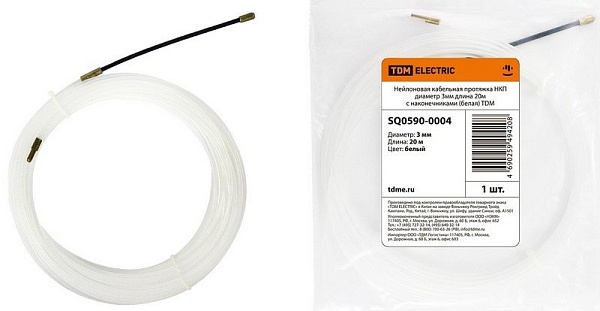 Устройство для протяжки кабеля, длина 20 м, диаметр прутка с оболочкой 3 мм, комплектуется медным наконечником и насадкой-заглушкой. Материал протяжки стеклопластиковый пруток с защитной оболочкой. Цвет белый.