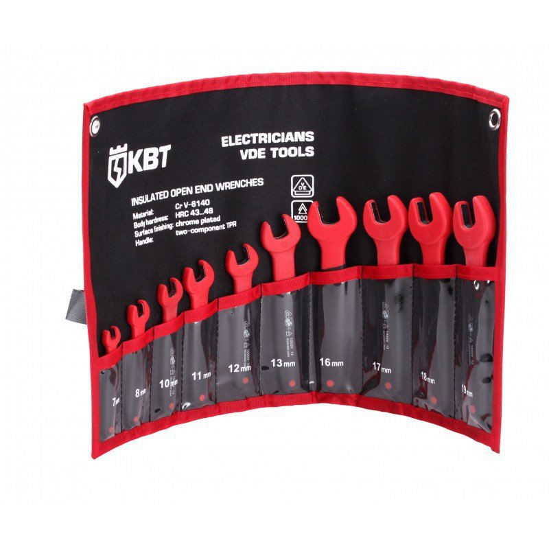 Набор однорожковых диэлектрических ключей, 10 ключей (7, 8, 10, 11, 12, 13, 16, 17, 18, 19 мм) для работы под напряжением до 1000 В, раскладная сумка с ремнем-липучкой и крепежными отверстиями, вес 970 г