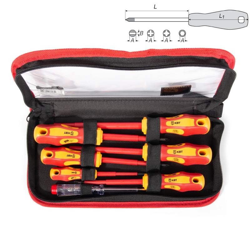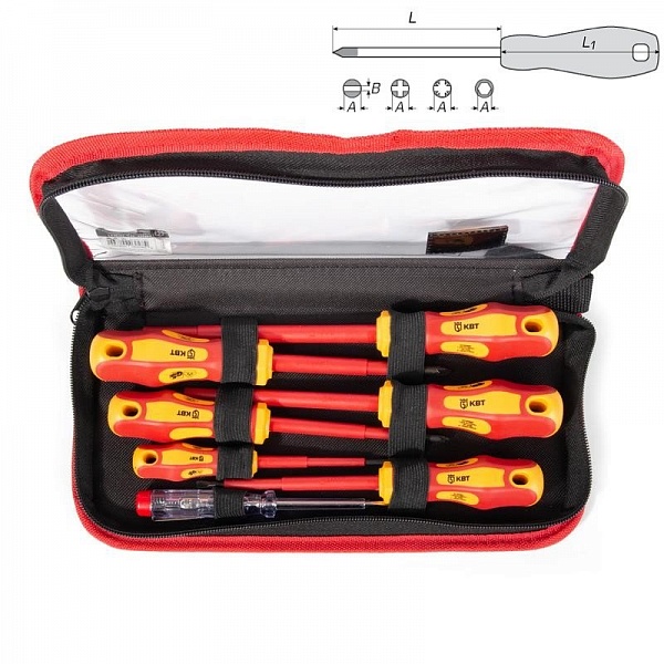 Набор диэлектрических отверток VDE, 7 шт. Для работ под напряжением до 1000 В. Состав набора: отвертка шлиц 2.5х75, отвертка шлиц 4х100, отвертка шлиц 5.5х125, отвертка шлиц 6.5х150, отвертка PZ1х80, отвертка PZ2х100, отвертка-индикатор шлиц