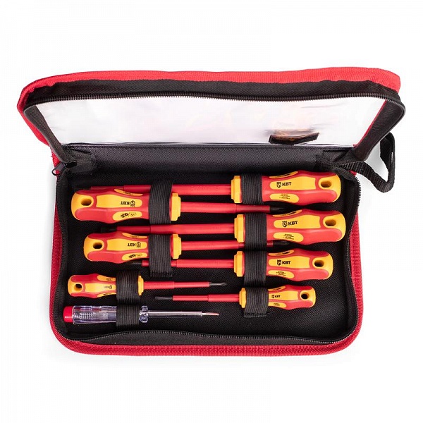 Набор диэлектрических отверток VDE, 8 шт. Для работ под напряжением до 1000 В. Состав набора: отвертка шлиц 2.5х75, отвертка шлиц 4х100, отвертка шлиц 5.5х125, отвертка шлиц 6.5х150, отвертка PH0х60, отвертка PH1х80, отвертка PH2х100, отвертка-индикатор шлиц
