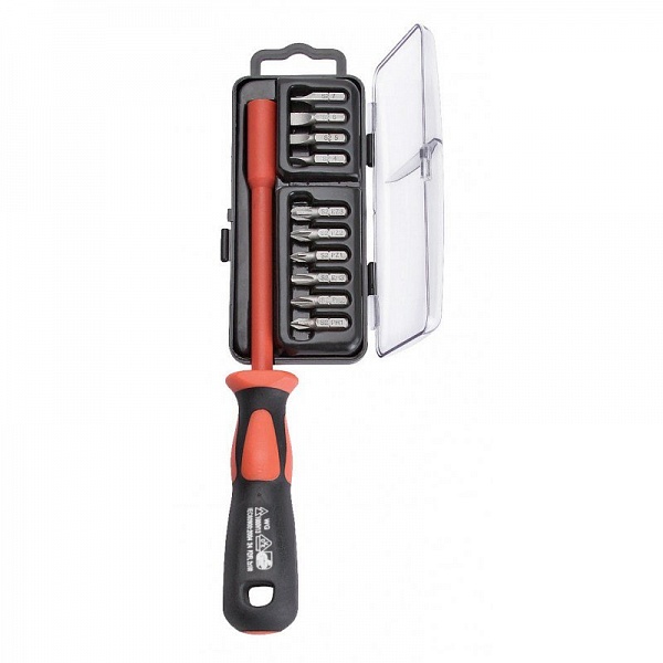 Диэлектрическая отвертка со сменными битами для работ под напряжением до 1000 В. В комплекте: Диэлектрическая отвертка с длиной стержня 125 мм. Биты шлицевые SL4, SL5, SL6, SL7. Биты крестовые PH: PH1, PH2, PH3. Биты Pozidriv PZ: PZ1, PZ2, PZ3.