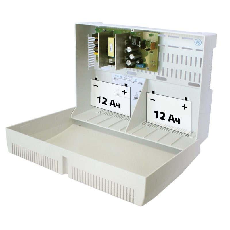 Резервированный источник питания; U-вых.20...28 В, I-вых.2.5 А(ном.), I-вых.3.5 А (max), U-вх.175...245 В, под 2 АКБ 12 В 7/12 Ач; диагностический релейный выход "НАЛИЧИЕ СЕТИ", световая индикация режимов работы, защита от короткого замыкания, защита аккумулятора от глубокого разряда; IP20, t-раб.-10...+40°С, 333х240х134 мм. Пластиковый корпус.