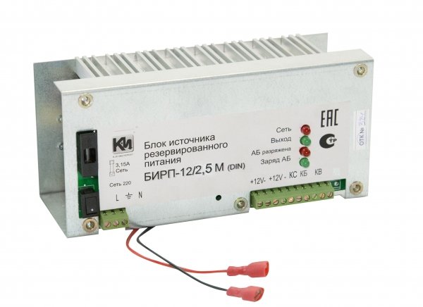 Источник вторичного электропитания резервированный,U-вх.150...265 В, U-вых.12 В, I-ном.2,5 А, I-max.2.8 А, до двух внешних аккумуляторов 12 В, световая индикация режимов работы, диагностические выходы «оптореле», наличия выходного напряжения, наличии АБ и наличии сети, электронная защита от короткого замыкания, защита аккумулятора от глубокого разряда, 190х90х80 мм, крепление на DIN-рейку.