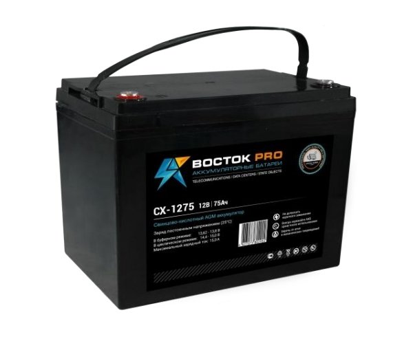 Свинцово-кислотный, герметичный аккумулятор, 12В/75Ач, клеммы под болт 6 мм, 258х166х220мм, 21кг