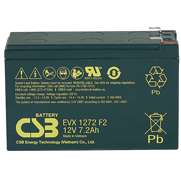 Свинцово-кислотный, герметичный аккумулятор, 12В/7,2Ач, ножевые клеммы 6.35х7.95 мм (F2), 150,9х64,8х98,6мм, 2,55кг