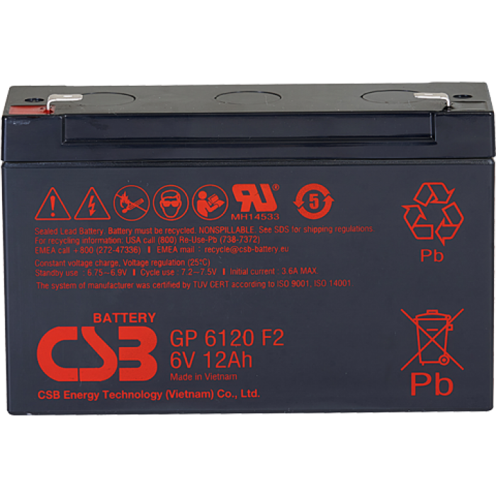 Свинцово-кислотный, герметичный аккумулятор, 6В/12Ач, ножевые клеммы 4.75х6.35 мм (F1), 151х50х100,5мм, 1,85кг
