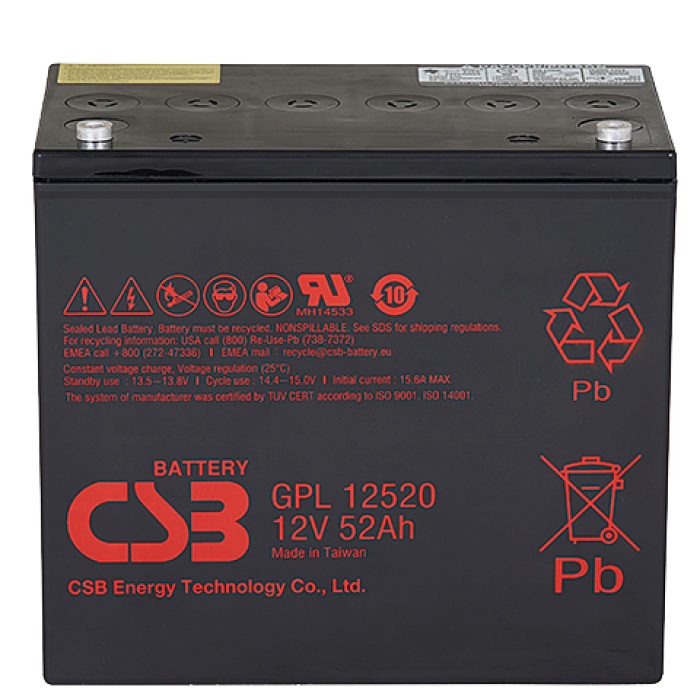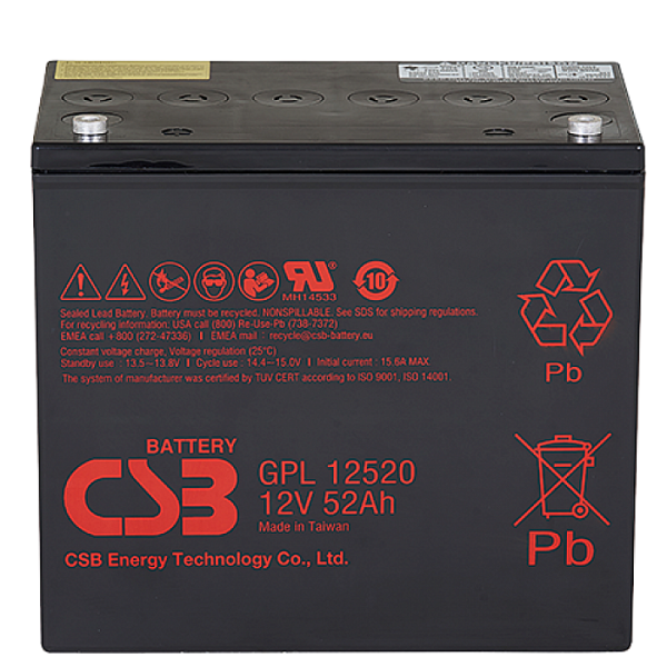 Свинцово-кислотный, герметичный аккумулятор, 12В/52Ач, под болт М6 (I2), 228х138,4х206,3мм, 17,2кг