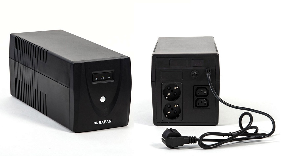 Источник бесперебойного питания, модифицированный синус; U-вх.170...290В, U-вых.220В, P-вых.1000ВА (600Вт), два встроенных АКБ 12В/7Ач, t-резерва 2.5мин.; 4 выходных разъема (2 шт. IEC 320 C13 (компьютерный), 2 шт. CEE 7/4 (розетка с заземлением)); холодный старт, световая и звуковая индикация режимов работы; IP20, t-раб.+5...+40°С, 147х160х380мм