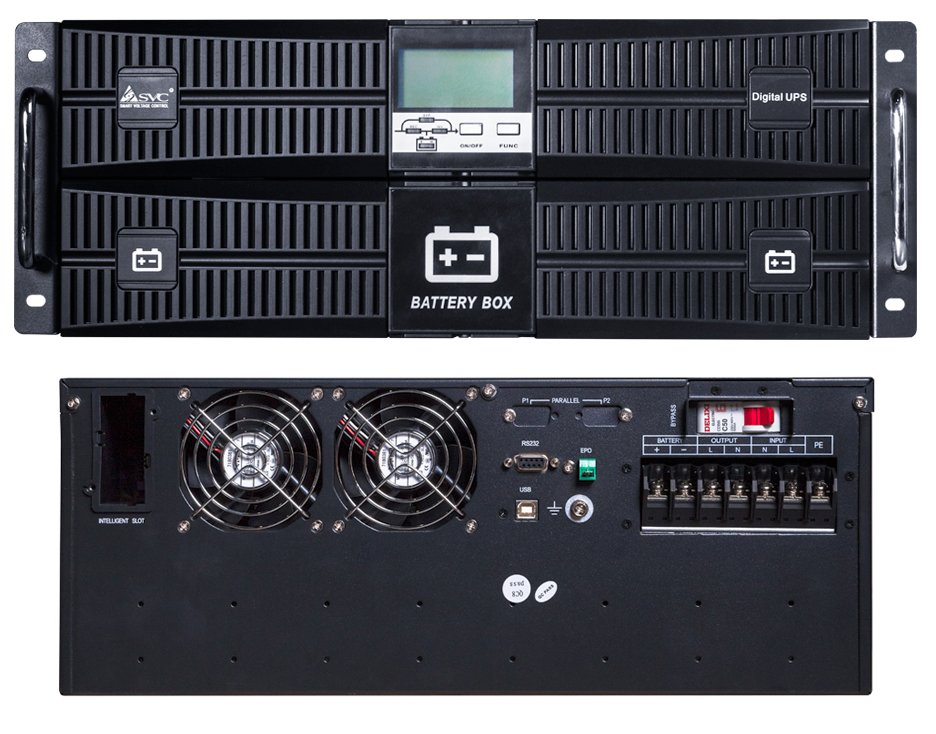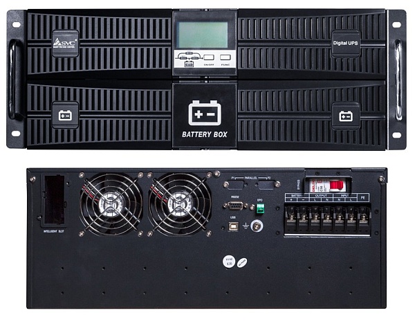 Источник бесперебойного питания On-Line для установки в 19" шкаф, высота 4U; U-вх.220В, U-вых.200/208/220/220/230В, P-нагр.10кВА/10кВт; под 16 АКБ 12В/9Ач, подключение внешних АКБ/блоков, U-шины.192В, I-заряд.1А; выходные разъемы: клеммная колодка; USB, RS232, SNMP; IP20, t-раб.0...+40°С, 670х440х175мм