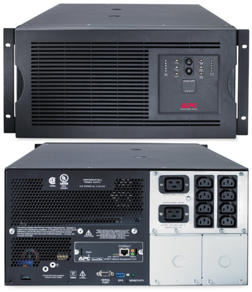 Источник бесперебойного питания Line-Interactive, светодиодный дисплей с индикаторами, стоечный; 5 000 ВА; АС 160-287 В; Нагрузка 4 000 Вт; cинусоидальный сигнал; Защита от перегрузки и КЗ; RS 232, плата Smartslot AP9630; Выход 8 IEC 320 C13; Вход IEC-320 C20 2,4м; 0 ...+40°С; 222х483х660мм.