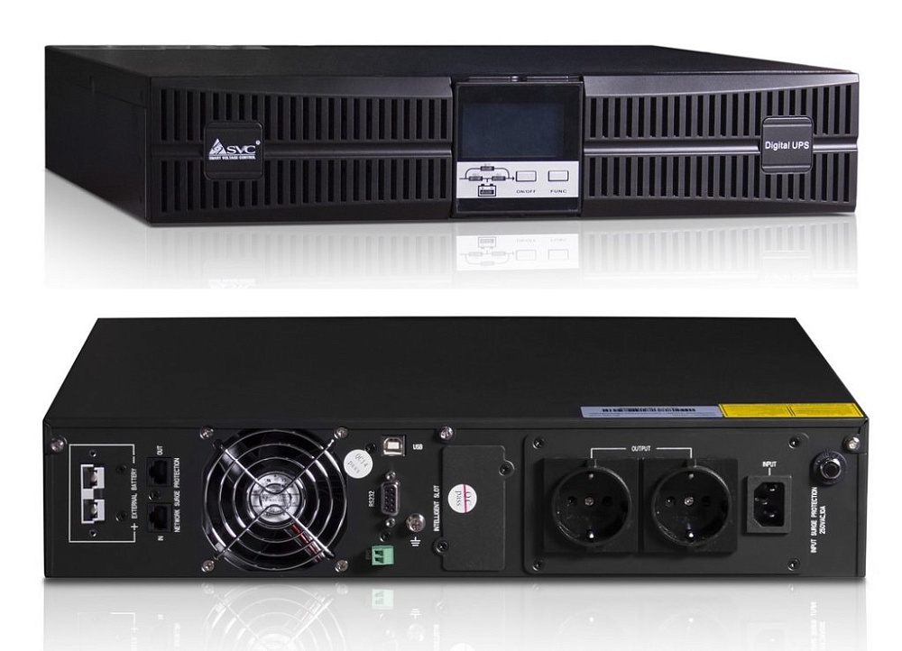 Источник бесперебойного питания On-Line для установки в 19" шкаф, высота 2U, чистая синусоида; P-нагр.3кВА/2.7кВт, U-вх.220В, AVR:110...288В, U-вых.200/230/240В±1% , Внешние АКБ/Блоки(не входят в комплект) (до 16 блоков), U-шина 96В, I-зар.4/8А; выходные разъемы 2хSchuko CEE7/4, LCD-дисплей, SNMP-слот, USB, RS-232; IP20, t-раб.0...+40°С, 490х440х88 мм