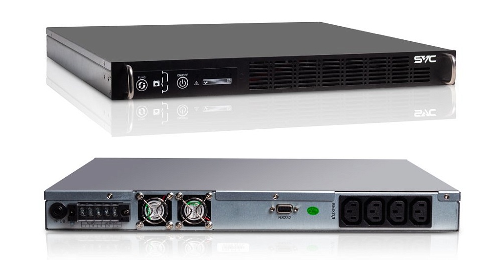 Источник бесперебойного питания On-Line для установки в 19" шкаф, высота 1U, чистая синусоида; P-нагр.1кВА/0.8кВт, U-вх.220В, AVR:90...300В, U-вых.230В±1%, 50/60±4Гц, АКБ 1х25.2В/8Ач (Литий-ионный), U-шина 25.2В; выходные разъемы 4хIEC-320-C13+Клеммная колодка; светодиодная индикация, RS-232; IP20, 438х440х44 мм