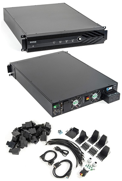 Источник бесперебойного электропитания, напряжение питания от сети переменного тока частотой 50 Гц 120...276 В, для установки в телекоммуникационный шкаф, высота 3U, выходное напряжение 220 В, номинальная мощность 10000 ВА / 7700 Вт, рекомендуемый аккумулятор 12 В/100...120 Ач до 20 шт., ЖК дисплей, диапазон рабочих температур 0...+40°С, габаритные размеры 445х710х131 мм