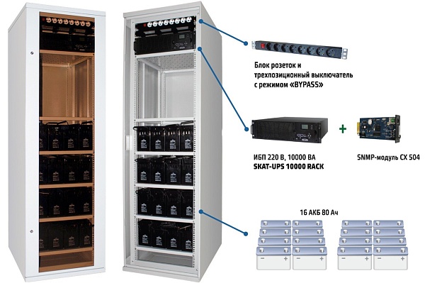 Комплекс бесперебойного питания с SNMP модулем, чистый синус, On-Line; U-пит.120...276 В, P-нагр.6000 ВА, место под АКБ 16/18/20 шт. до 100 Ач; 19" шкаф, 600х800х1990 мм, дверца с закаленным стеклом, замок, возможность установки вентиляционных модулей.