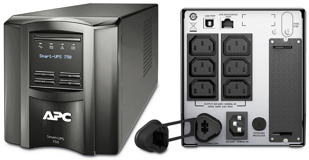Источник бесперебойного питания Line-Interactive с ЖК дисплеем; 750 ВА; АС 160-286 В; Нагрузка 500 Вт; cинусоидальный сигнал; Защита от перегрузки и КЗ; USB, SmartSlot; Выход 6 IEC 320 C13; Вход IEC-320 C14 1,8м; 0 ...+40°С; 157х138х358мм.