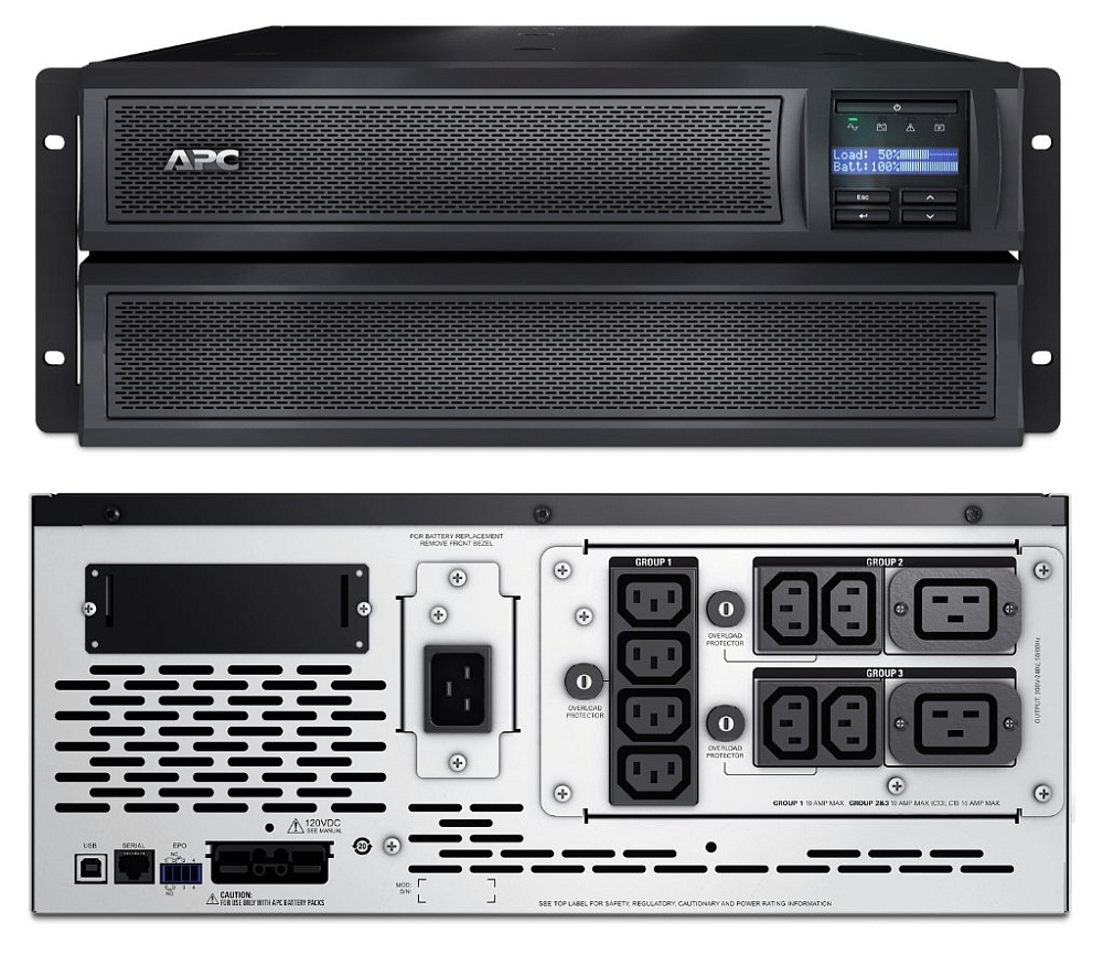 Источник бесперебойного питания Line-Interactive с ЖК дисплеем стоечный; 2 200 ВА; АС 140-280 В; Нагрузка 1 980 Вт; cинусоидальный сигнал; Защита от перегрузки и КЗ; USB, SmartSlot; Выход 8 IEC 320 C13; Вход IEC-320 C20 1.8м; 0 ...+40°С; 432х178х483мм. Для увеличения времени автономной работы SMX120BP.