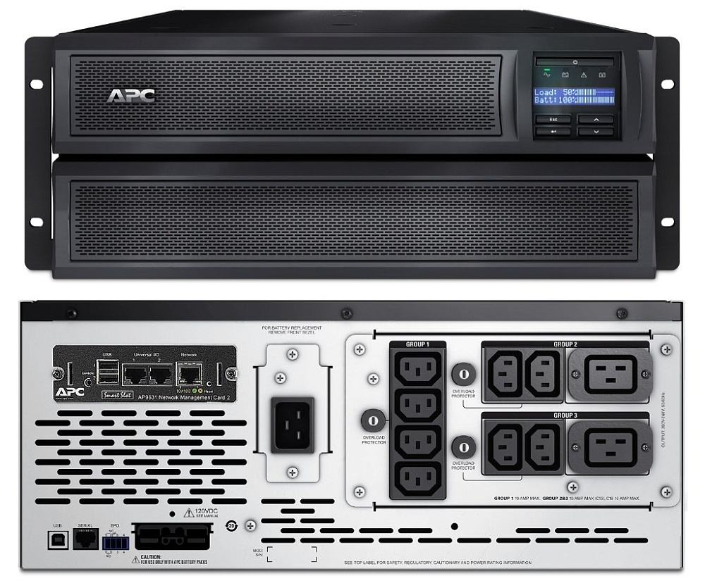 Источник бесперебойного питания Line-Interactive с ЖК дисплеем стоечный; 2 200 ВА; АС 140-280 В; Нагрузка 1 980 Вт; cинусоидальный сигнал; Защита от перегрузки и КЗ;RJ-45; USB, плата SmartSlot AP9631; Выход 8 IEC 320 C13; Вход IEC-320 C20 1.8м; 0 ...+40°С; 178x432x483мм. Для увеличения времени автономной работы SMX120BP.