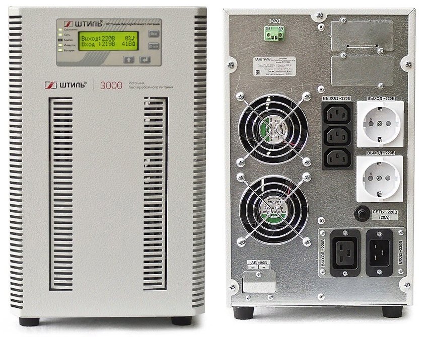 Источник бесперебойного питания 220 В напольный, on-line (с двойным преобразованием), чистая синусоида, 3000 ВA (2700 Вт); встроенные аккумуляторы, 8 х 12В/9Ач, U-акб.96 В, I-заряд.1 А; ЖК-дисплей; выходные разъёмы - IEC-320-C13 (3 шт.), EURO F-type с заземлением (2 шт.), IEC-320-C19 (1 шт.); холодный старт, совместим с генератором; IP20, t-раб.+5...+40°С, 346х210х443 мм