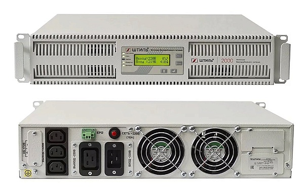 Источник бесперебойного питания 220 В в стойку, on-line (с двойным преобразованием), чистая синусоида, 2000 ВA (1800 Вт); под внешние аккумуляторы, U-акб.72 В, I-заряд.4 А; ЖК-дисплей; выходные разъёмы - IEC-320-C13 (3 шт.), IEC-320-C19 (1 шт.); холодный старт, совместим с генератором; высота 2U; IP20, t-раб.+5...+40°С, 88х466х440 мм