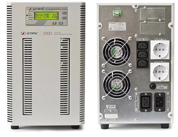 Источник бесперебойного питания 220 В напольный, on-line (с двойным преобразованием), чистая синусоида, 2000 ВA (1800 Вт); под внешние аккумуляторы, U-акб.72 В, I-заряд.4 А; ЖК-дисплей; выходные разъёмы - IEC-320-C13 (3 шт.), EURO F-type с заземлением (2 шт.), IEC-320-C19 (1 шт.); холодный старт, совместим с генератором; IP20, t-раб.+5...+40°С, 346х210х443 мм