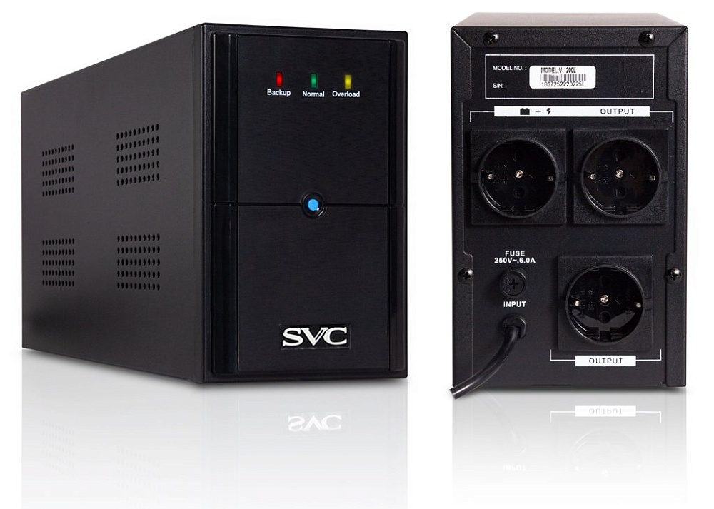 Источник бесперебойного питания Line-Interactive 1200 ВА; АС 145-290 В; Нагрузка 720 Вт; Модифицированный синус; 2 АКБ 12 В, 7.5 Ач; Защита от перегрузки и КЗ; Розетка 3хSchuko; 0 ...+40°С; 192х124x340 мм.