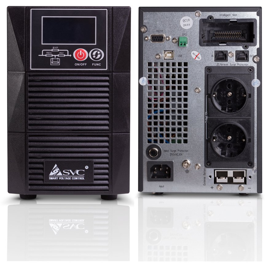 Источник бесперебойного питания On-Line, чистая синусоида, LCD-дисплей; U-вх.220В, U-вых.200/208/220/220/230В, P-нагр.1кВА/900Вт; под 3 АКБ 12В/7Ач, подключение внешних АКБ/блоков, U-шины.36В, I-заряд.1А; выходные разъемы: 2 разъема Schuko CEE7/4; SNMP/USB/RS-232; IP20, t-раб.0...+40°С, 355х146х230мм. Напольный.