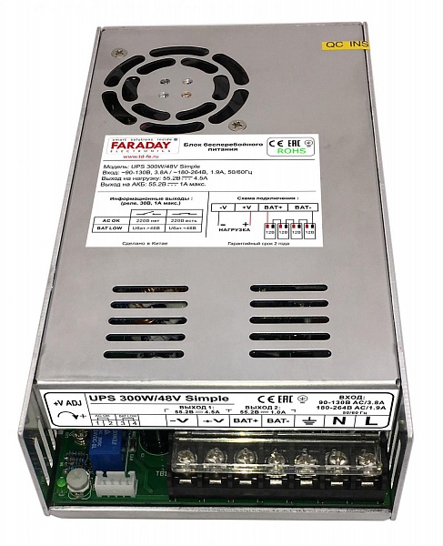 Источник электропитания стабилизированный импульсный бесперебойный; U-вх.180...264 В, U-вых. 48...55.6 В, Ток вых.4.5А; под АКБ 12 В 7…17 Ач 4 шт.; t-раб.-20…+70°C, 215х115х50 мм. Крепление на DIN рейку. Автоматическая защита от КЗ, перегрузки и низкого разряда АКБ. Отсутствие провалов питания при переключении. В комплект не входят провода подключения к АКБ.