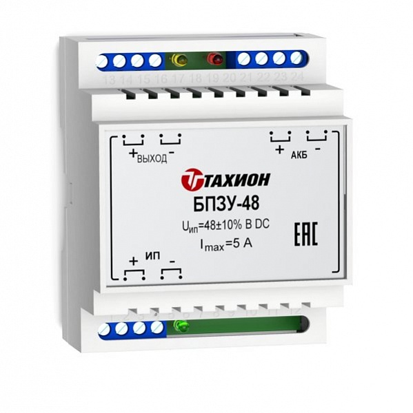 Блок переключения питания с зарядным устройством БПЗУ-48 предназначен для создания системы бесперебойного питания с использованием внешнего источника питания 48 В и четырех подключенных последовательно 12 В АКБ, время прерывания при переключении на резервное питание 5... 10 мс; при работе от сети U-вх DC 48±10% В; U-вых DC 48±10% В/8А, при работе от АКБ U-вых DC 38... 54 В; -40...+60°С, 90х70х58 мм.