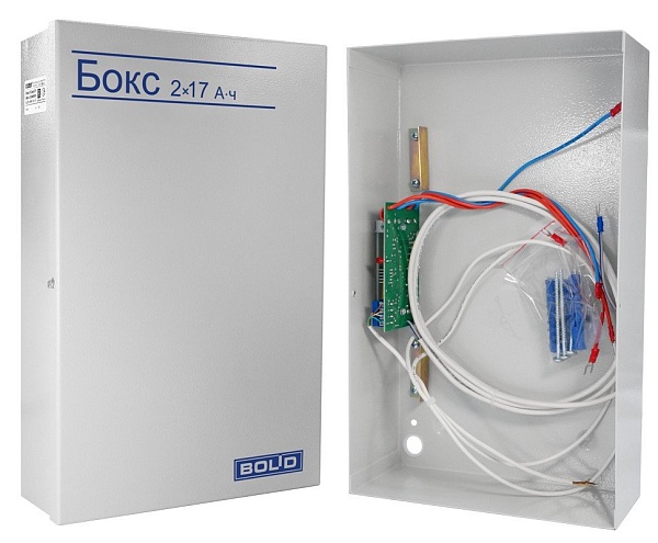Бокс под доп.АКБ (2х12В/17Ач) для РИП-12-3/17 М1-Р (РИП-12 исп.15), РИП-12-3/17П1-Р (РИП-12 исп.16), РИП-12-8/17 М1-Р (РИП-12 исп.17); U-вых.10...14В, I-вых.мах 8А, 2 вых. «ОК», t-раб.-10...+40°C, 222х356х96 мм