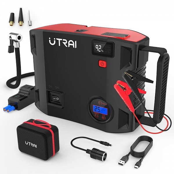 Пуско-зарядное устройство 24000 мАч, встроенный воздушный компрессор, ЖК-экран. светодиодный фонарь; U-пит. 5 В/2А (type-C), выходы USB1 5В/3А, USB2 5В/2А, DC 5.5x2.1 12В/8А, EC5 12В/I-пуск. 200 А, t-раб.-20…+75°C, габ.размеры 201х154х77 мм. Может запускать бензиновые двигатели до 8.0л и дизельные до 6.5 литров. В комплекте: пусковые провода с зажимами "крокодил", кабель питания type-C, переходник DC 5.5x2.1 на прикуриватель, адаптеры для компрессора 3 шт., сумка.