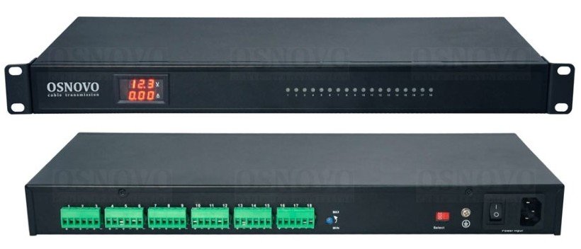 Блок питания на 18 каналов, для монтажа в 19'' стойку 1U, DC 12V, 0,56А на канал(макс ток до 2А, при одновременном использовании не более 5 каналов), суммарно до 10А. Общая выходная мощность до 120Вт. Допускается кратковременная нагрузка на канал 4А(5 сек). Функция регулировки напряжения на выходе в пределах от 10 до 14В с помощью удобного подстроечного регулятора. Активное охлаждение с помощью 2х вентиляторов на корпусе сбоку. Защита от КЗ, перегрузок по току и напряжению. LED индикаторы подключенной нагрузки. Дополнительный LCD дисплей для отображения параметров. Переключатель входного напряжения 115/230В. Крепеж для стойки, а также резиновые ножки для настольного использования в комплекте. -20…+40°С. 440х45х210мм.