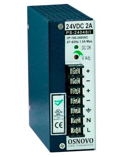 Промышленный блок питания; DC 24, 2 000мA, 48 Вт. Регулировка выходного напряжения в диапазоне 22-26 В, Защита от КЗ и перегрузки;. Конвекционное охлаждение Монтаж на DIN-рейку/стену; -40...+50°C; 40x110x121 мм.