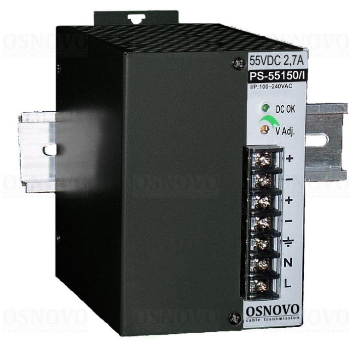 Промышленный блок питания. DC55V, 2,7A (150W). Диапазон входных напряжений: AC100-240V. КПД: 83%. Регулировка выходного напряжения в диапазоне 50-60V. Защита от короткого замыкания, перенапряжения и перегрузки. Конвекционное охлаждение. -40...+50 °C; 75x110x121мм. Монтаж на DIN-рейку или стену.