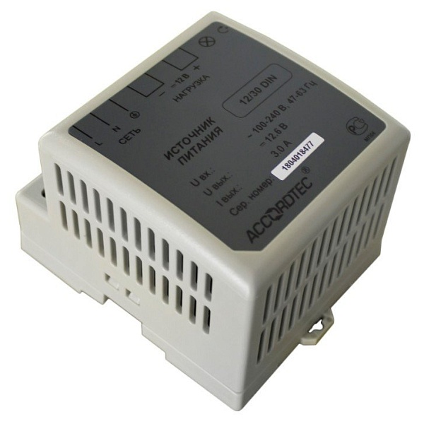 Источник вторичного питания стабилизированный, U-вх. ̴110...240 В, U-вых. =11,5...14 В ±5% В (регулируется), I-ном. 3 А, I-макс. 3.5 А, защита от КЗ и перегрузки, IP67, t-раб. +10...+40 °С, габ.размеры 94х78х67 мм, пласт.корпус на DIN-рейку