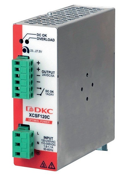 Источник питания стабилизированный серии "OPTIMAL POWER" с креплением на DIN рейку; U-вх. ̴90...264 В (50 Гц), U-вх. =100...345 В, I-потр. ≤ 1.9 А; U-вых.пост. 48 ± 1% (регул. 45...55 В), I-вых.пост. ном. 2.5 А; свет.индикатор "DC OK"/"ALARM", выход "СК" "Авария" 24В/1А; IP20, t-раб. -20...+70°C, габ.размеры 40×130×115 мм. Встроенный ORing диод для параллельного подключения с резервированием