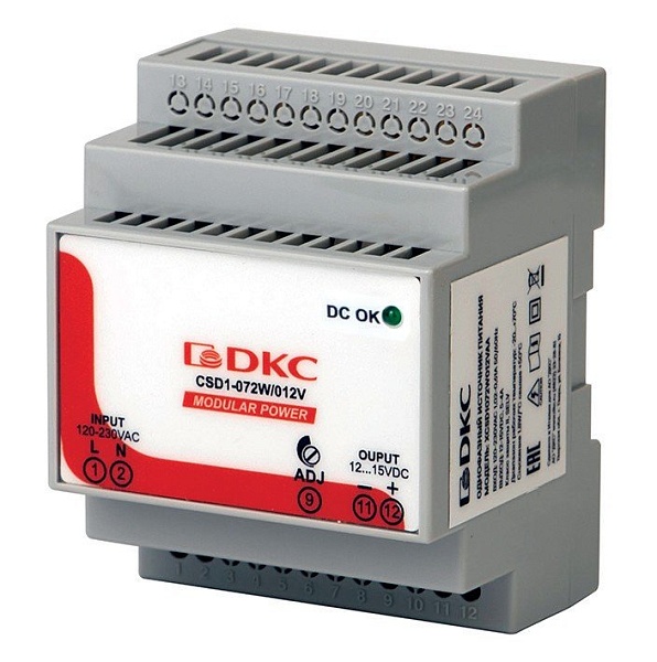 Источник питания стабилизированный серии "MODULAR POWER" с креплением на DIN рейку; U-вх. ̴85...264 В (50 Гц), U-вх. =100...370 В, I-потр. ≤ 1.17 А; U-вых.пост. 24 ± 1% (регул. 23,5…27,5 В), I-вых.пост. ном. 3 А; свет.индикатор "DC OK", IP20, t-раб. -20...+70°C, габ.размеры 71×62×90 мм. Возможно параллельное подключение с внешним ORing диодом для резервирования