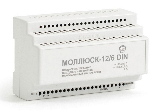 Источник питания на DIN рейку, U-вых.12В, I-вых 6А, P-потр.90Вт, t-раб.0...+40°C, защита от перегрузки и КЗ, 139х89х65 мм