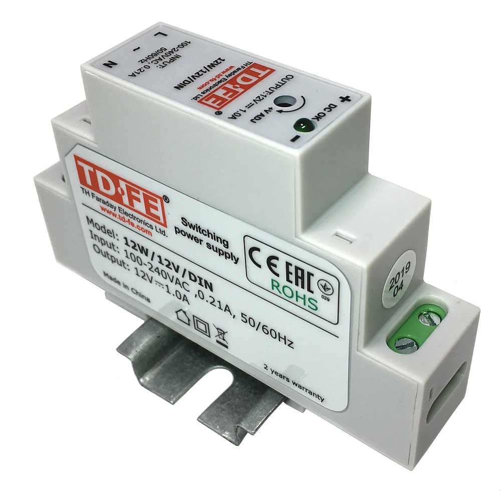 Источник электропитания стабилизированный импульсный, для установки на DIN-рейку; U-вх.100...240 В, U-вых. 12 В, I-вых.1 А, P-вых.12Вт; защита от перегрузок и КЗ; t-раб.-10…+70°C, 91х63х19,5 мм.