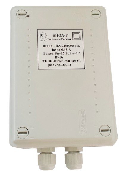 12 В стабилизированный, ток 3 А круглосуточно, импульсный, уличный, пластиковый корпус, IP56, t-раб.-30...+40°С, 130х85х50 мм