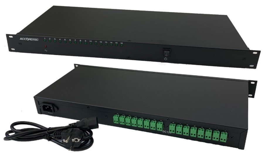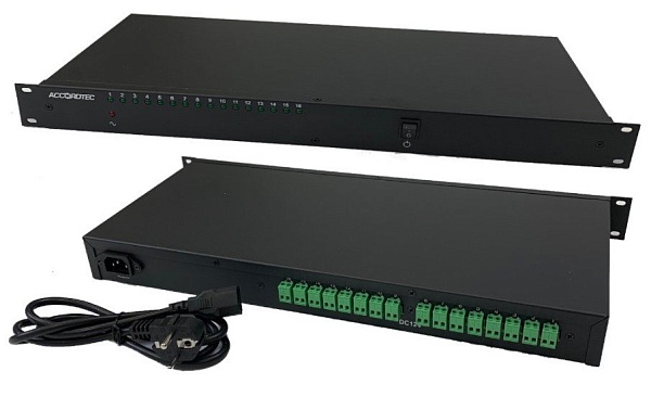 Источник питания стабилизированный для установки в 19" стойку, высота корпуса 1U; U-вх. ̴110...250 В, U-вых. пост. 11,7...14,7 В (регул.), 16 выходов по 1 А; t-раб. -15...+50°C, габ.размеры 465х200х45 мм