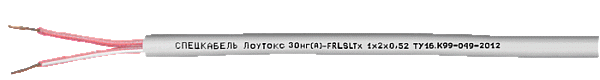 Кабель со сдвоенными параллельными парами, однопроволочными диаметром 0,52 мм медными жилами с изоляцией из огнестойкой кремнийорганической резины. В оболочке D=7,5 мм, из ПВХ пластиката пониженной пожароопасности с низким дымо- и газовыделением с низким показателем токсичности продуктов горения. Оболочка белого цвета.