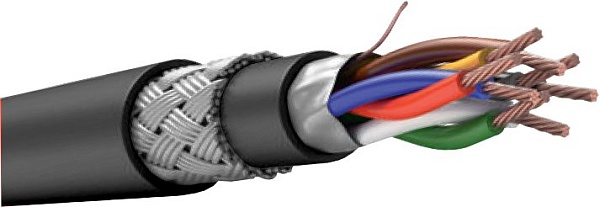 Кабель с многопроволочной центральной жилой в изоляции из полимерной композиции и в броне в виде оплетки из медных стальных оцинкованных проволок и защитном шланге из негорючей полимерной композиции,не содержащей галогенов, в общем экране из алюмолавсановой ленты с контактным проводником из медной луженой проволоки, в оболочке из негорючей полимерной композиции и в броне в виде оплетки из медных стальных оцинкованных проволок и защитном шланге из негорючей полимерной композиции,2х2х1,5 мм.кв.