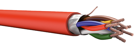 Кабель с многопроволочной центральной жилой в изоляции из полимерной композиции, не содержащей галогенов, в общем экране из алюмолавсановой ленты с контактным проводником из медной луженой проволоки, в оболочке из негорючей полимерной композиции, 2х2х2,5 мм.кв.