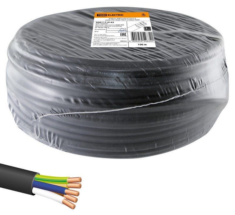 Кабель силовой круглый, с пониженным газо- и дымовыделением, не поддерживающий горение при групповой прокладке, оболочка ПВХ-пластикат; 5 медных однопроволочных жил сечением 1,5 ммᶻ, Ø-внеш. 10,36 мм, U-ном. 0,66 кВ; t-монт. не ниже -15°С, t-раб. -50...+50°С; бухта 100м, масса 18.74 кг
