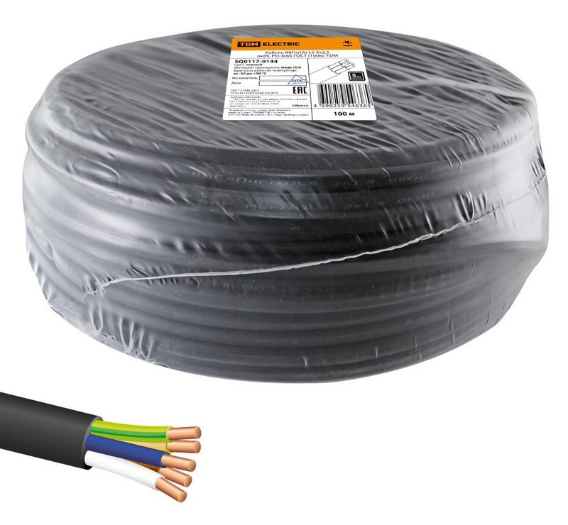 Кабель силовой круглый, с пониженным газо- и дымовыделением, не поддерживающий горение при групповой прокладке, оболочка ПВХ-пластикат; 5 медных однопроволочных жил сечением 2,5 ммᶻ, Ø-внеш. 11,38 мм, U-ном. 0,66 кВ; t-монт. не ниже -15°С, t-раб. -50...+50°С; бухта 100м, масса 24.84 кг