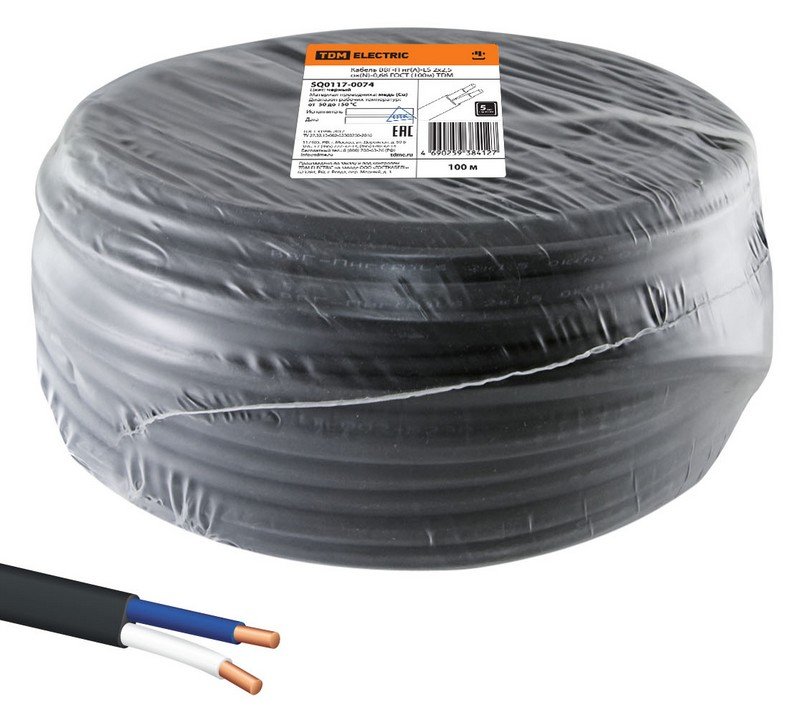 Кабель силовой плоский, с пониженным газо- и дымовыделением, не поддерживающий горение при групповой прокладке, оболочка ПВХ-пластикат; 2 медные однопроволочные жилы сечением 2,5 ммᶻ, внеш.размер 5.63х8.66 мм, U-ном. 0,66 кВ; t-монт. не ниже -15°С, t-раб. -50...+50°С; бухта 100м, масса 9.91 кг